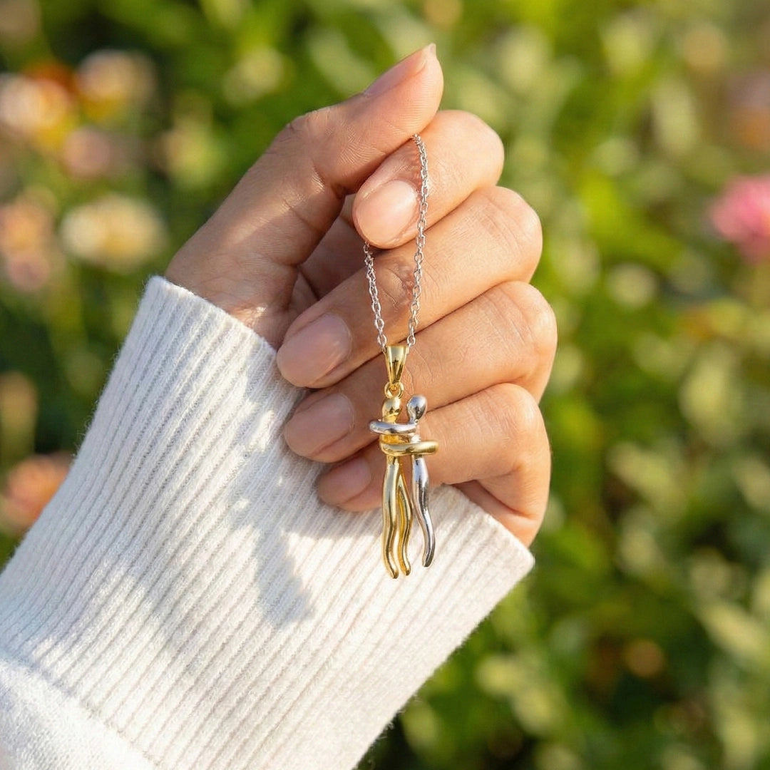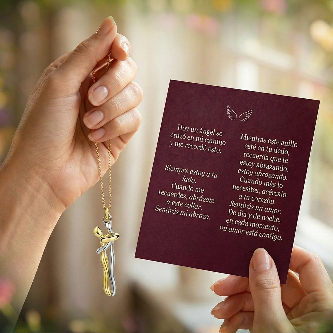 Nuestro conjunto de collar y anillo abrazo está fabricado en acero inoxidable con baño de oro de 14k de alta calidad, diseñado para representar un abrazo lleno de cariño, protección y conexión emocional.