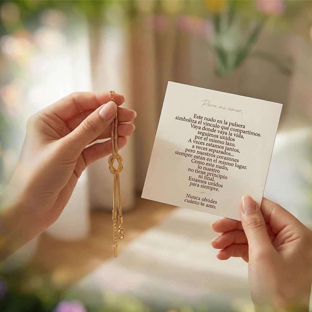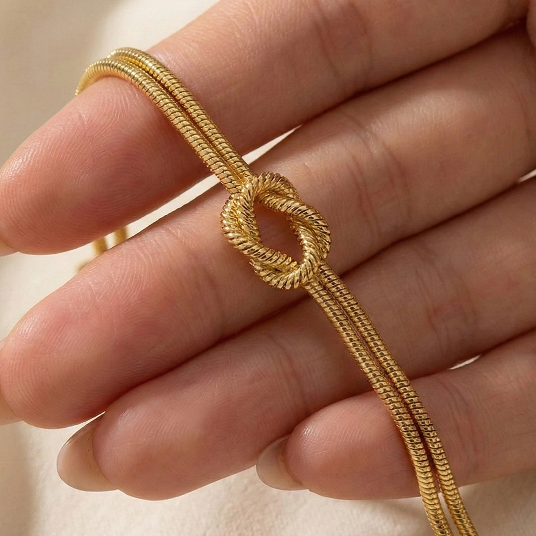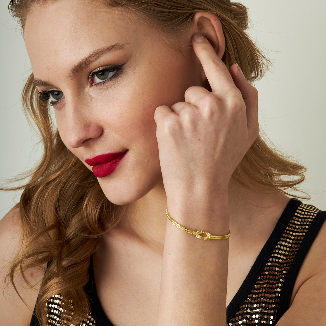 Nuestra pulsera Love Knot está fabricada en acero inoxidable con baño de oro de 14k y baño de oro blanco de 14k, diseñada para simbolizar el amor y la conexión eterna.