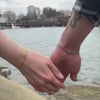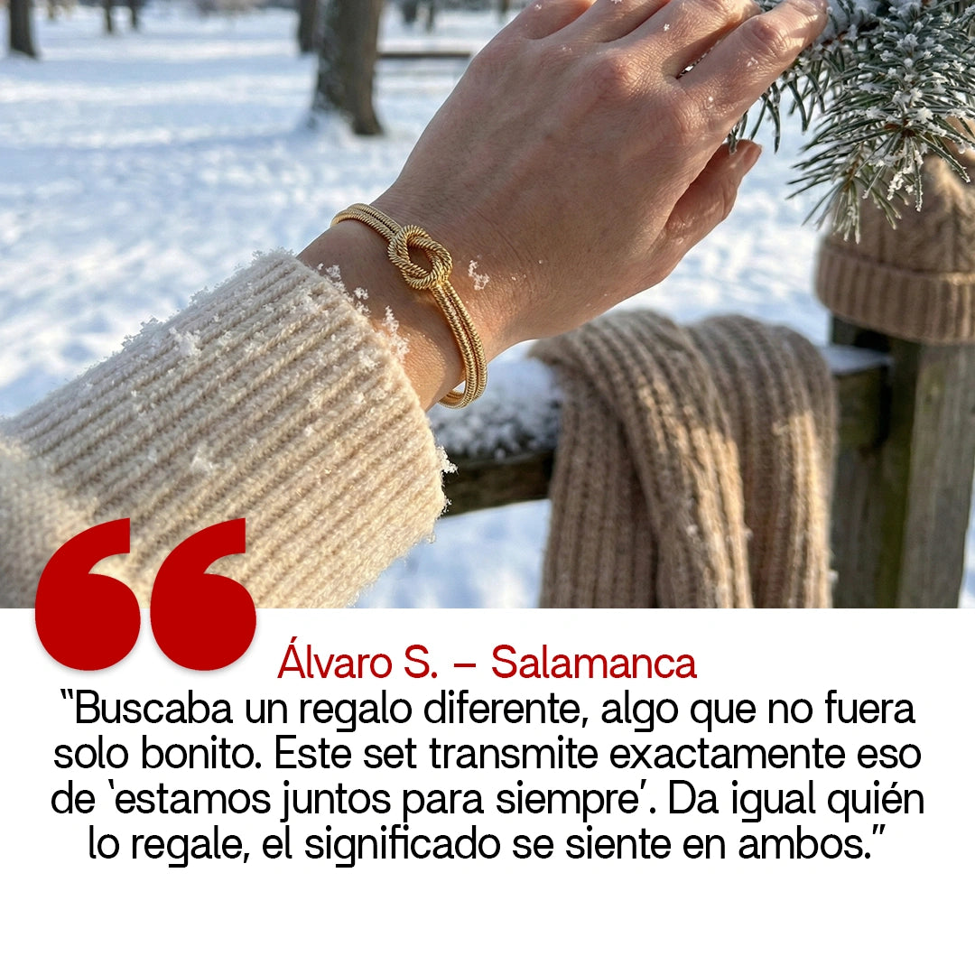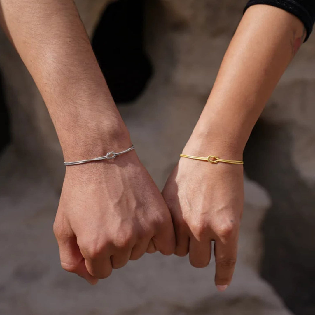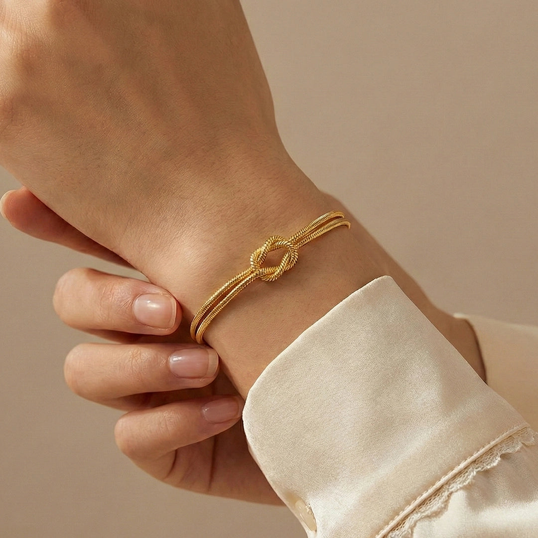Nuestra pulsera Love Knot está fabricada en acero inoxidable con baño de oro de 14k y baño de oro blanco de 14k, diseñada para simbolizar el amor y la conexión eterna.