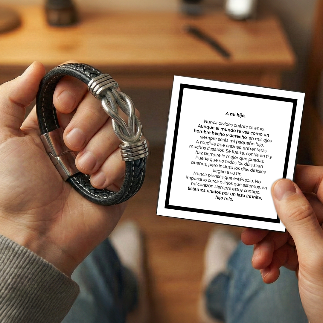 Esta pulsera combina cuero resistente con detalles de acero inoxidable, uniendo fuerza y elegancia en una sola pieza pensada para el uso diario. El símbolo de infinito representa un amor que no termina, un lazo que se fortalece con el tiempo y una promesa que se renueva cada día.